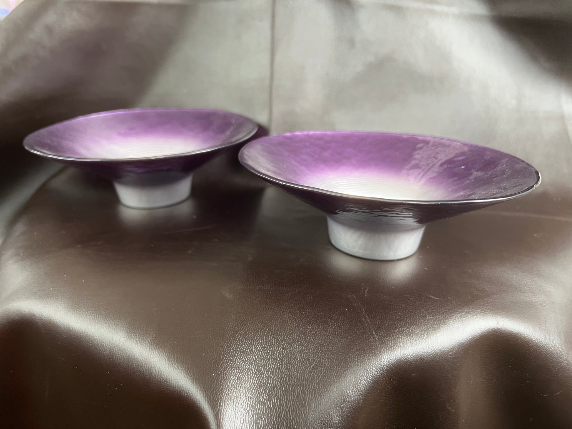 Rare Portmeirion Dusk Till Dawn Tea Light Holders Purple Silver Set of 2 VGC with no chips or cracks. Each tea light holder measures approximately: 5cm H x 15cm rim diameter x 5cm base diameter.