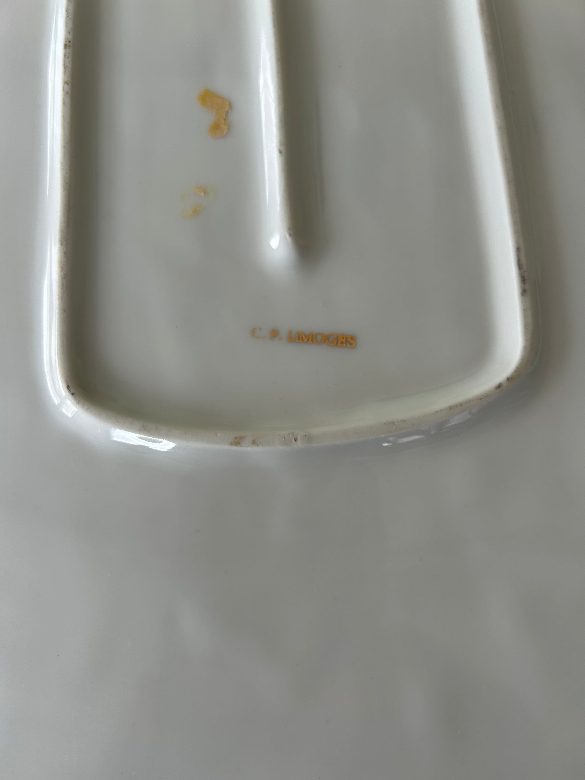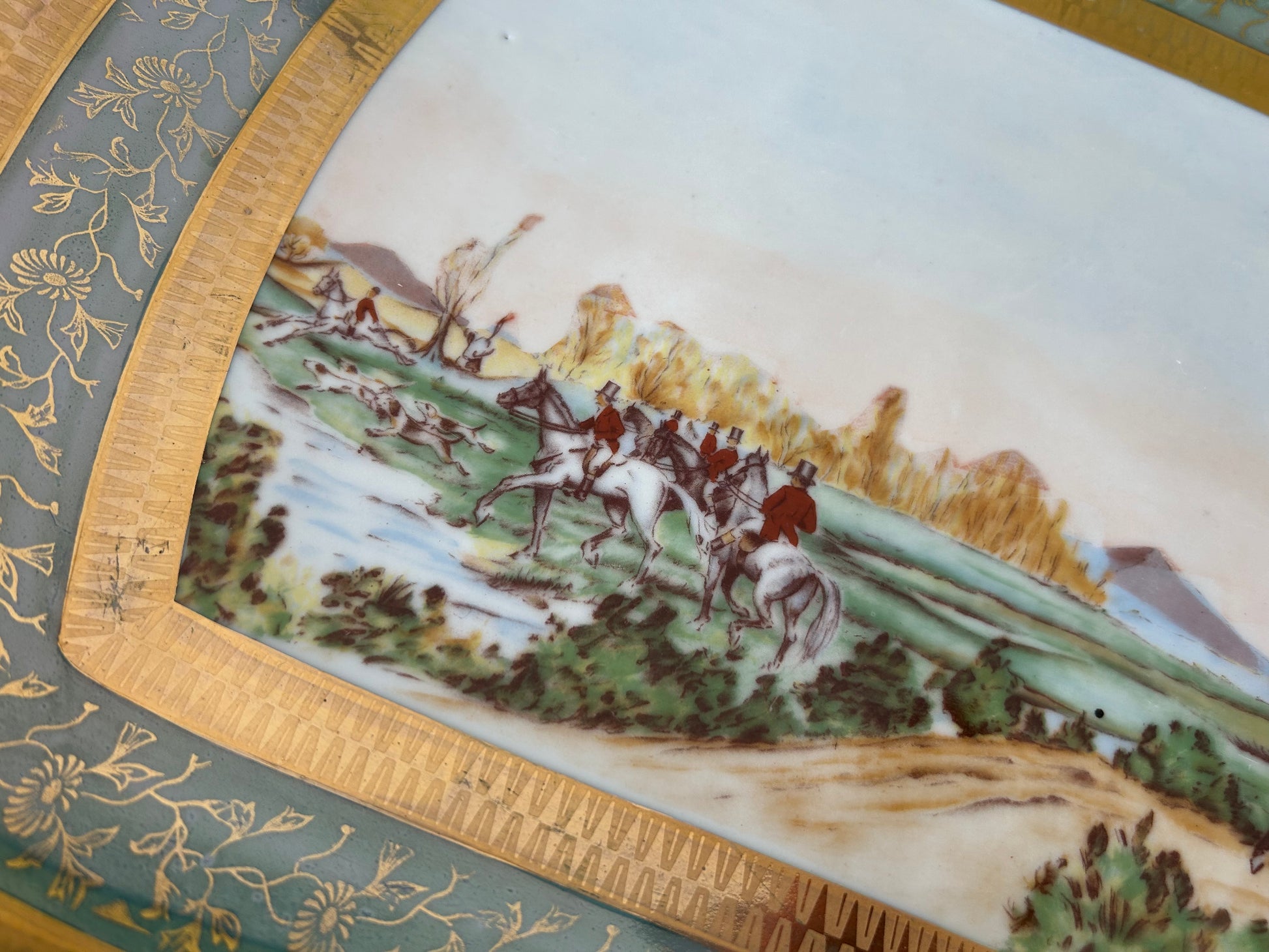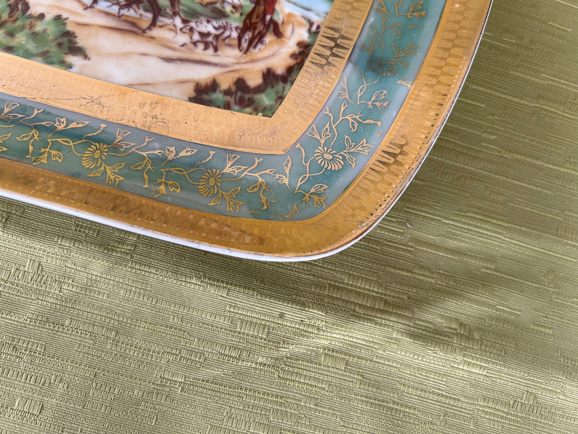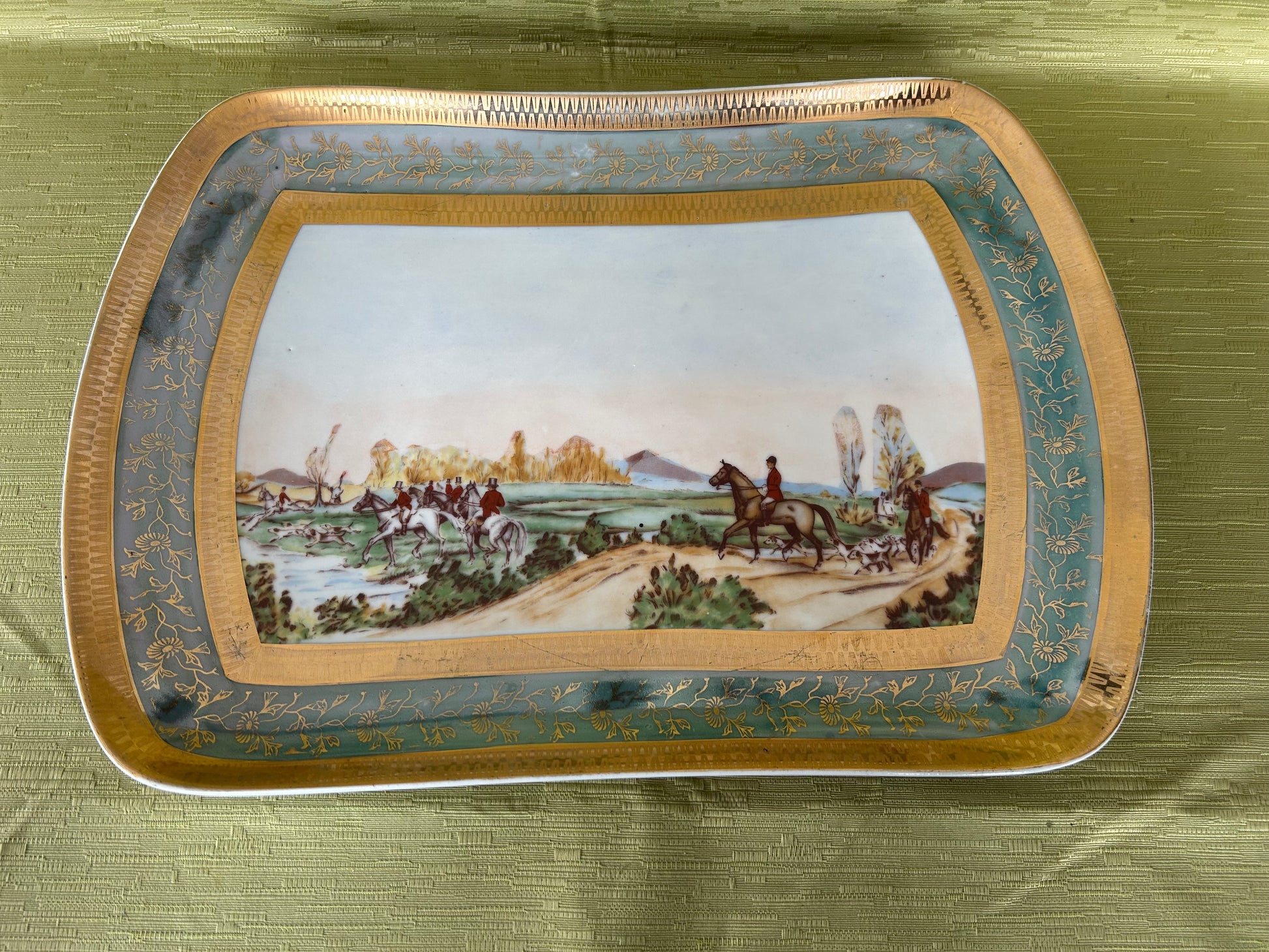 Rare C P Limoges hunting scene serving platter / tray. This porcelain serving tray has a striking Hunting scene with vibrant green / gold colourings and is perfect for display or use. There are no chips or cracks