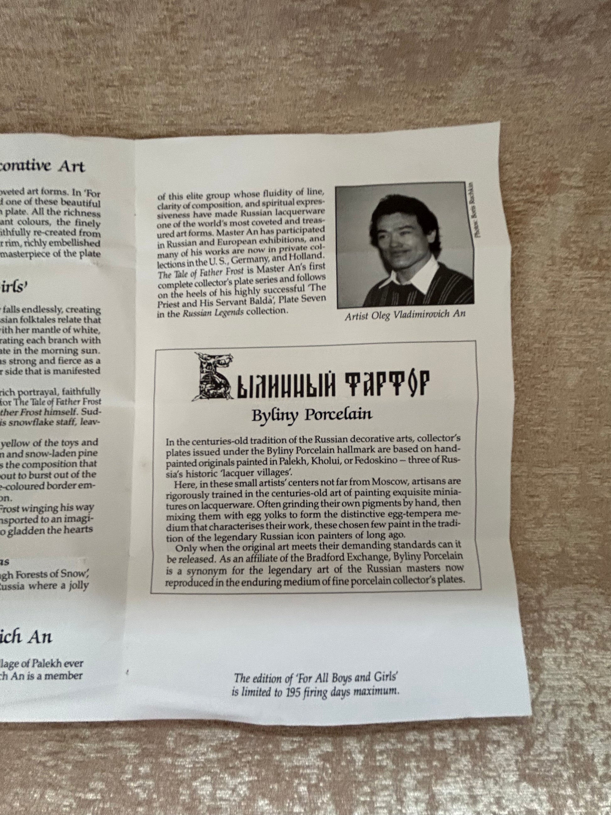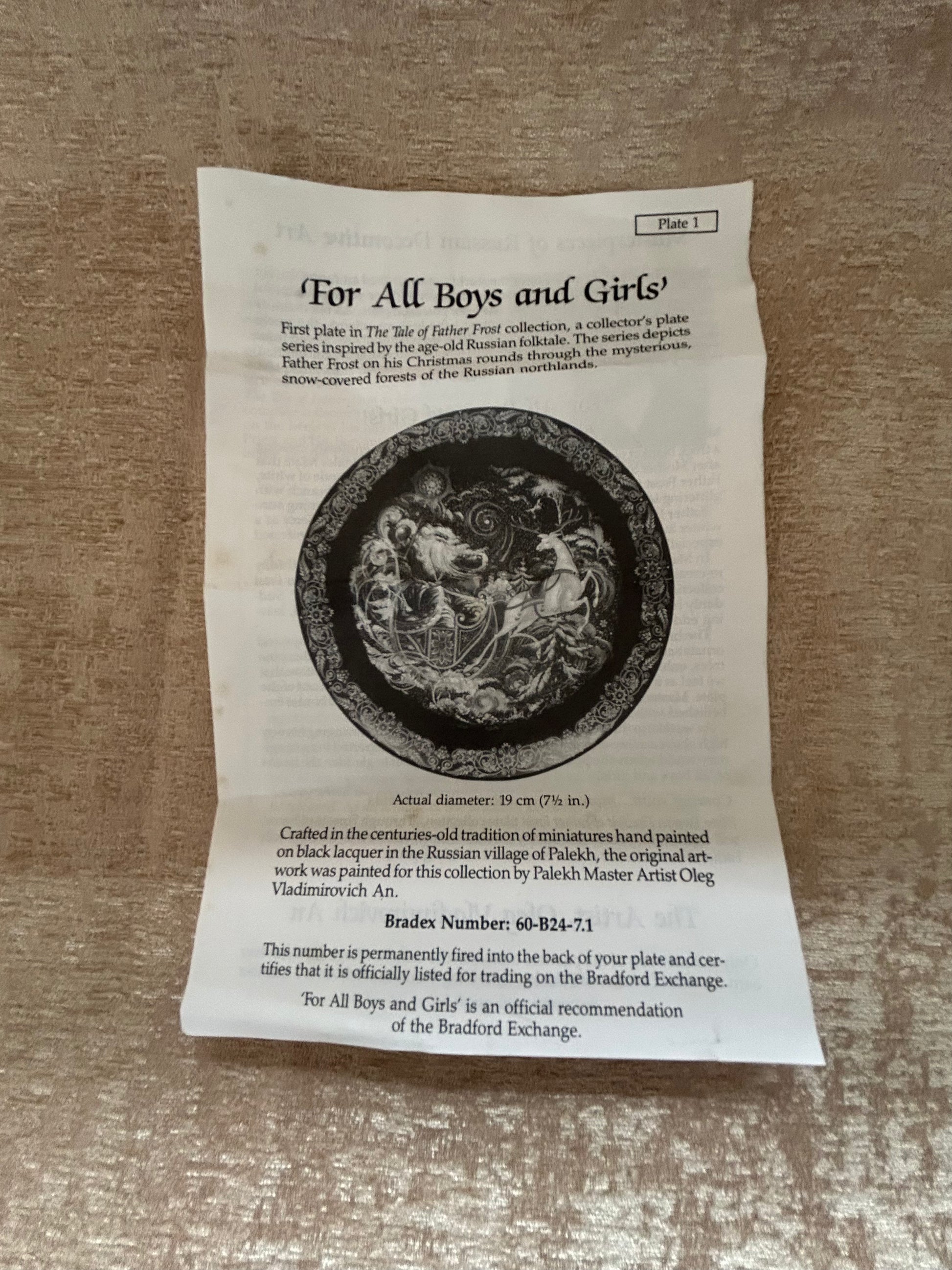 Rare Russian 1992 Tale Of Father Frost Plate Oleg Vladimirovich. This is a rare find in the UK, the description on the rear of the plate is in Russian, it comes with its original booklet which is in English. It has no chips or cracks and measures approximately 19.5cm in diameter.