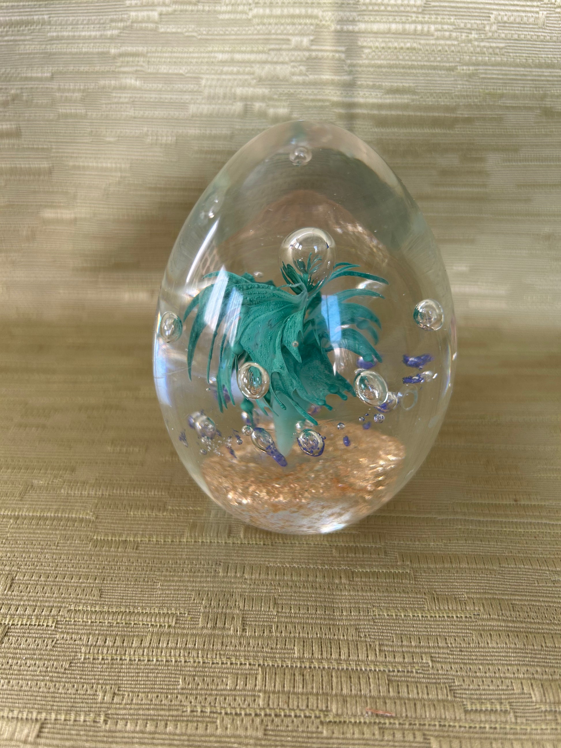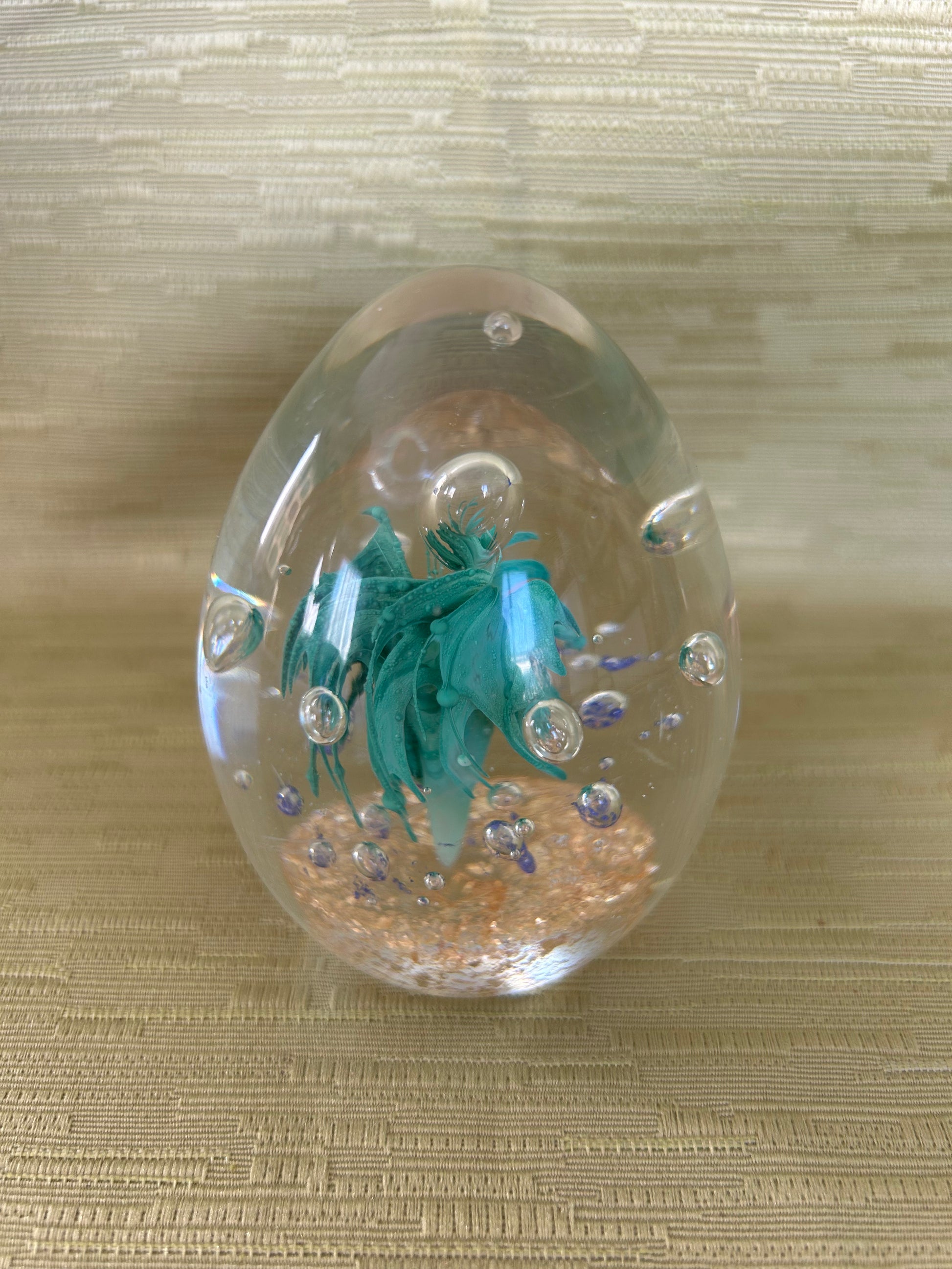 Vintage Glass Egg Shaped Paperweight with Gold Palm Tree