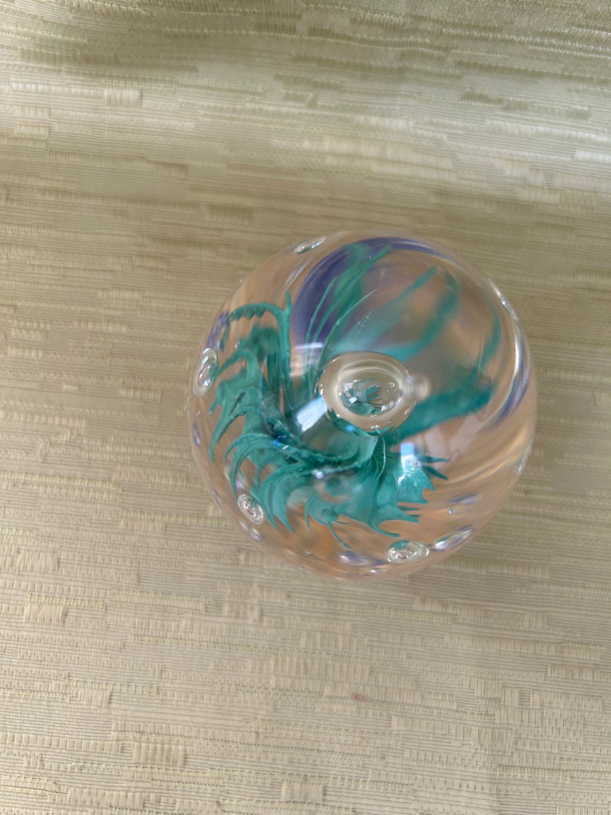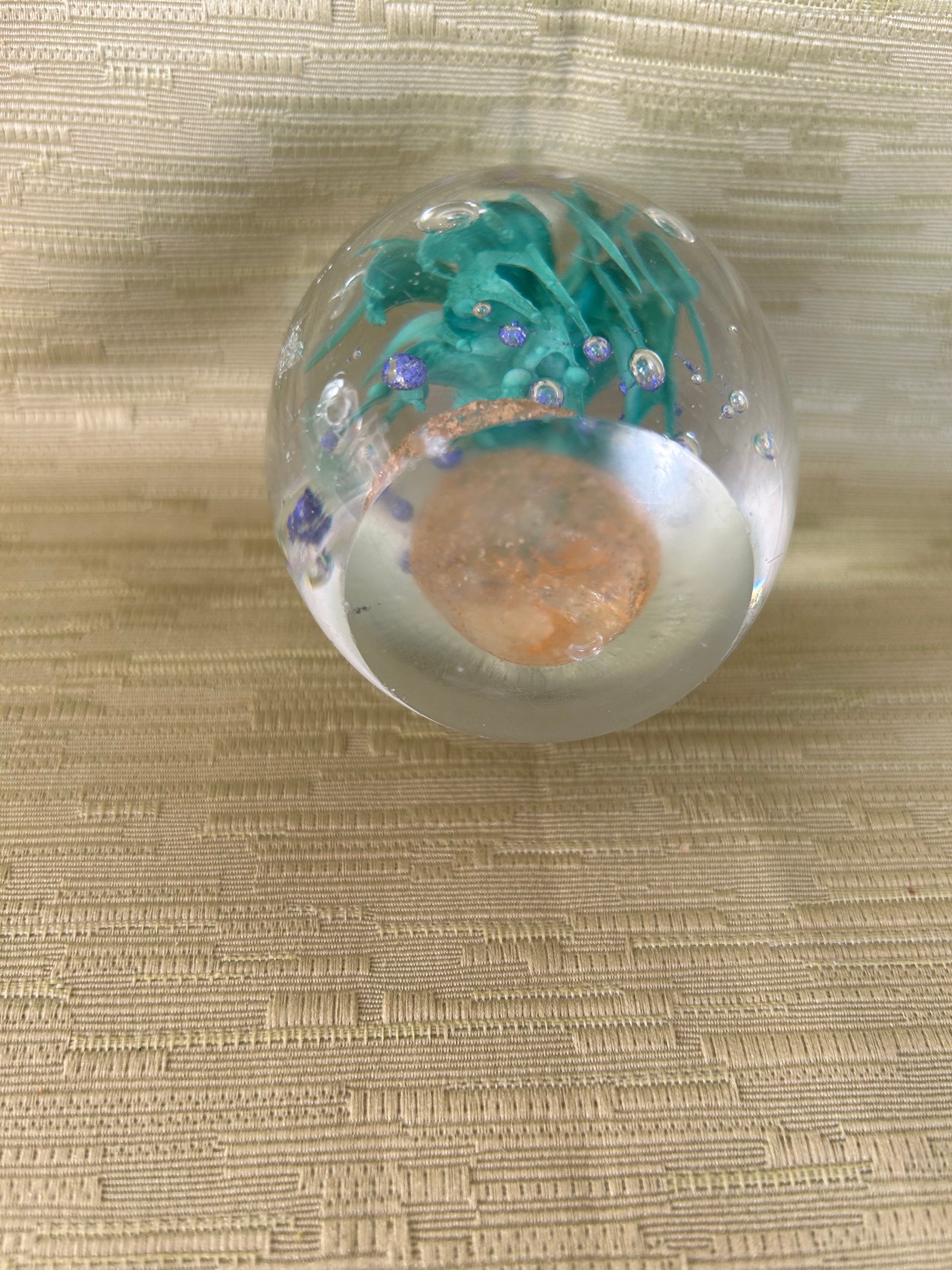 This vintage glass egg shaped paperweight features a striking gold and green tree design, giving it a unique and artistic appeal. Handmade with a glossy finish, this decorative piece, there are a couple of tiny tiny nibbles to the base corner and a couple of ‘flaws’ but they are within the glass this doesn’t detract from its appearance