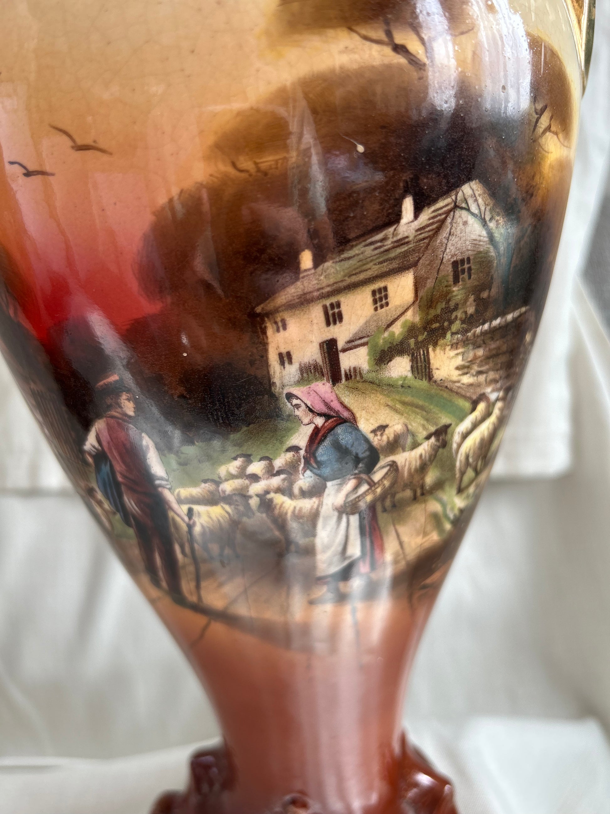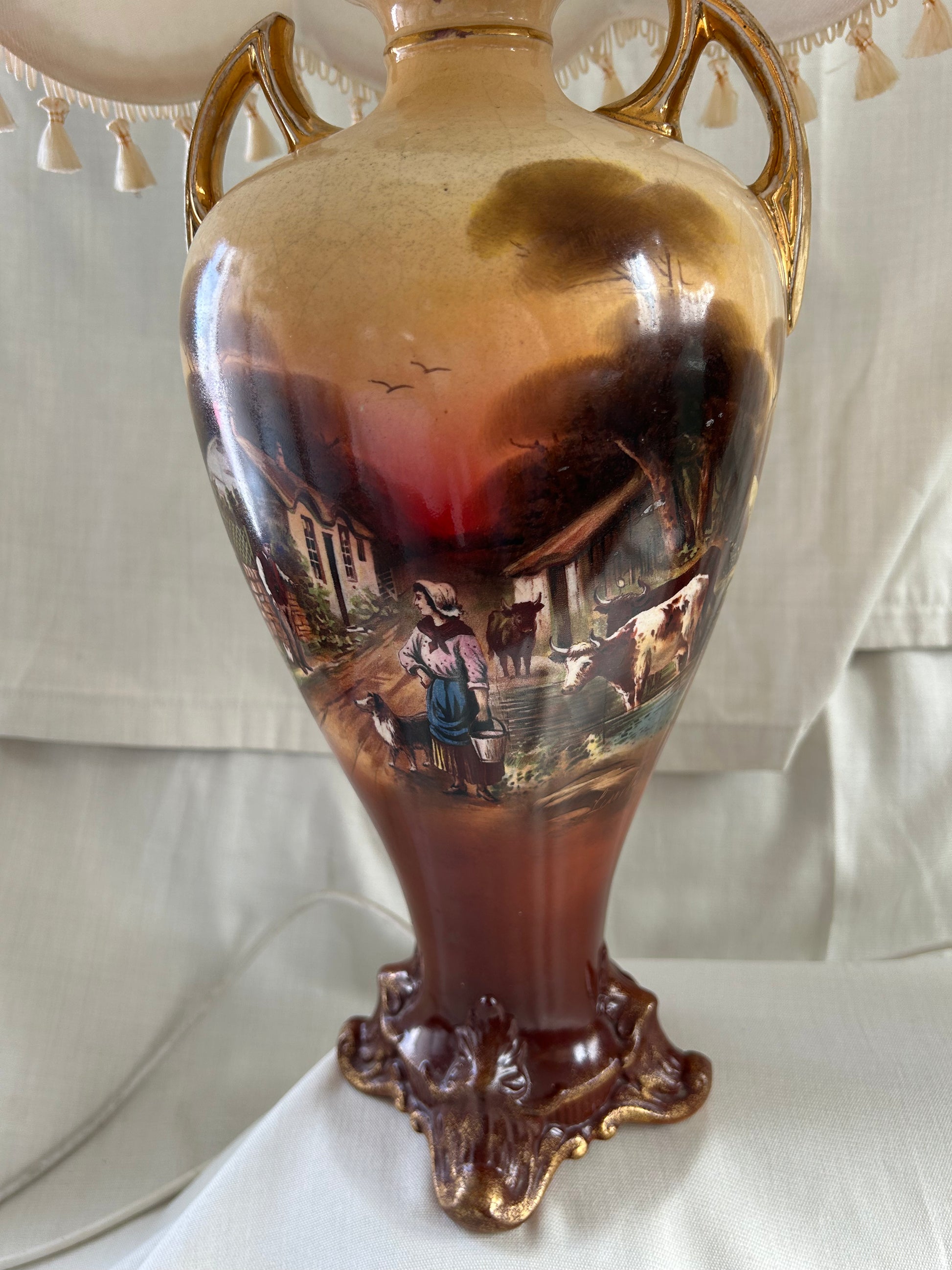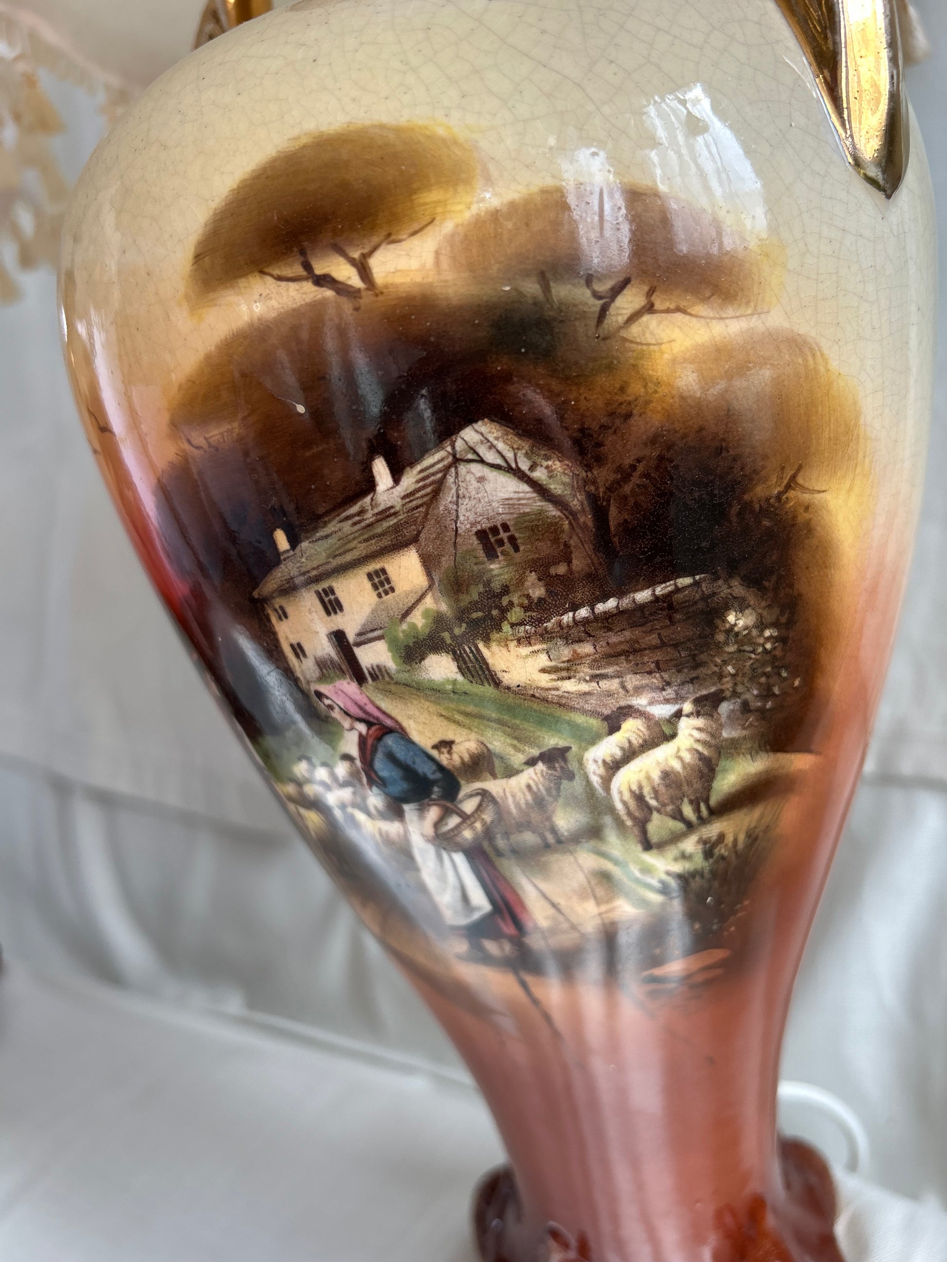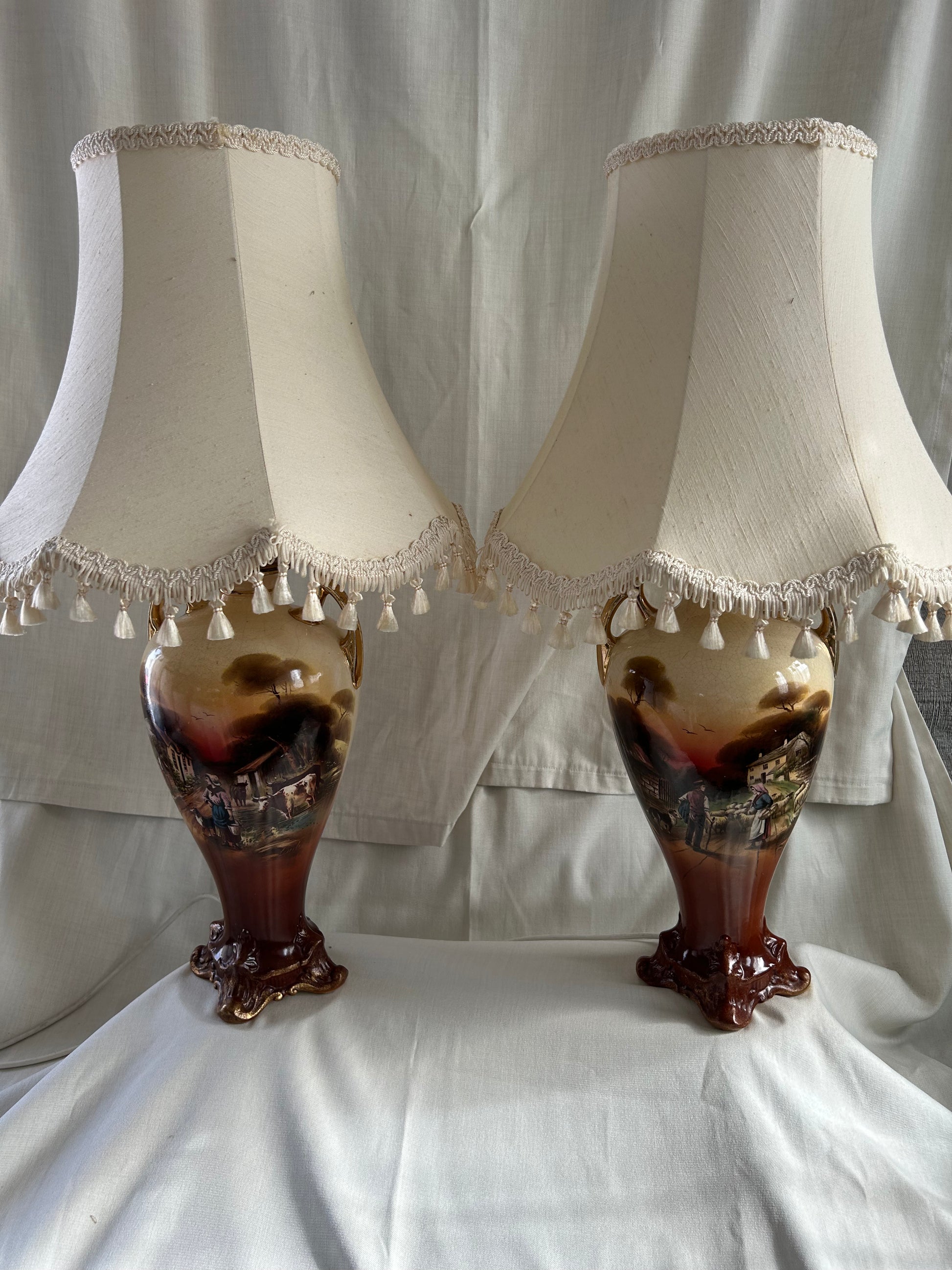 Vintage Rare Falcon pastoral Ware Pottery Vases Converted To Lamps. Stunning pair of falcon pastoral ware lamps converted from vases. Pretty scenes to the front and roses to the rear, the Gilt on parts of the lamps is worn in places and there is crazing to both lamps see photos. Both working but one needs a bulb holder which will be replaced. The number on the base which reads 730. Shades measure 30.5cm H x 36cm base diameter x 18cm rim diameter - Lamps measure 39cm H x 16cm w at its widest point
