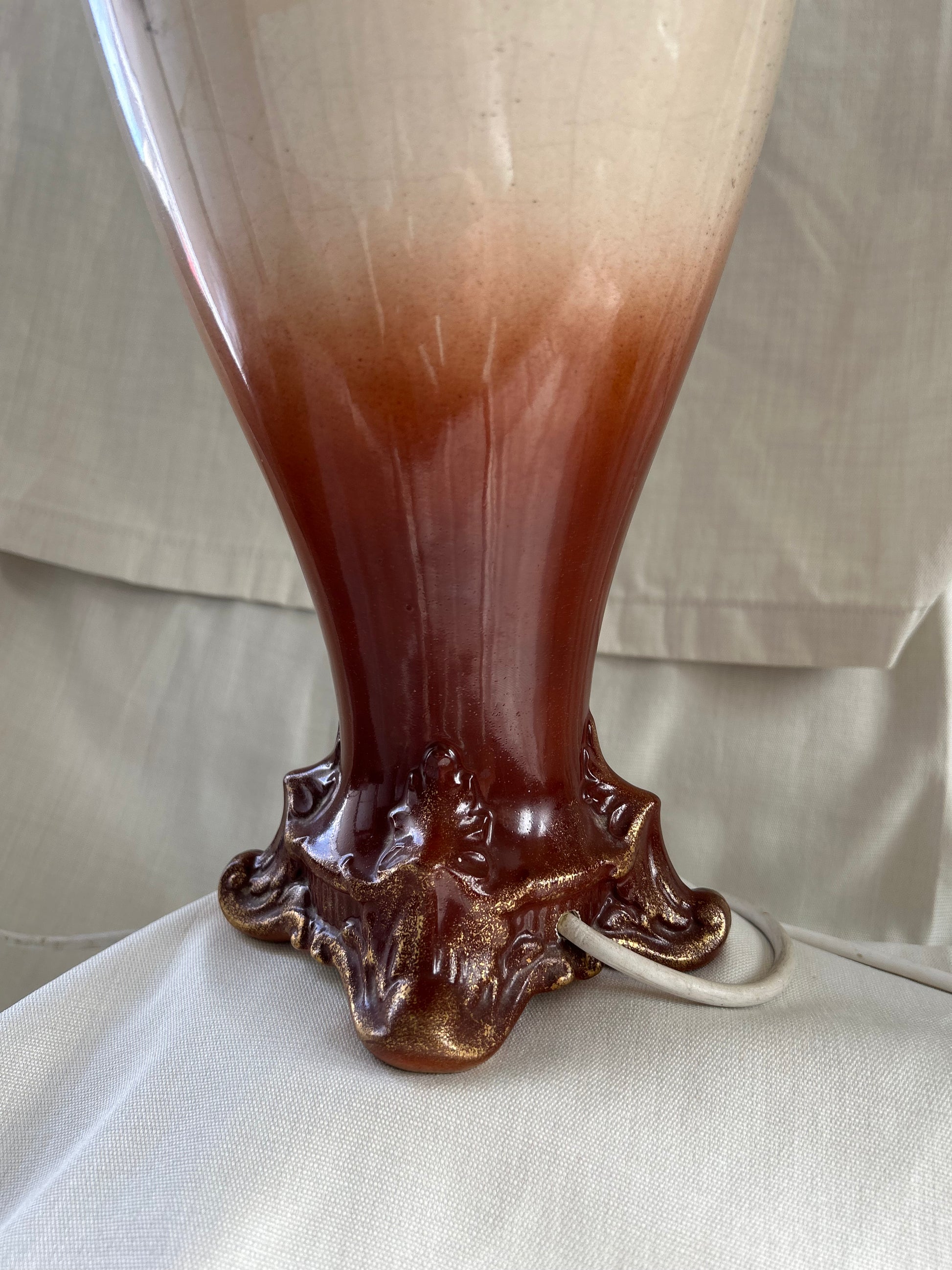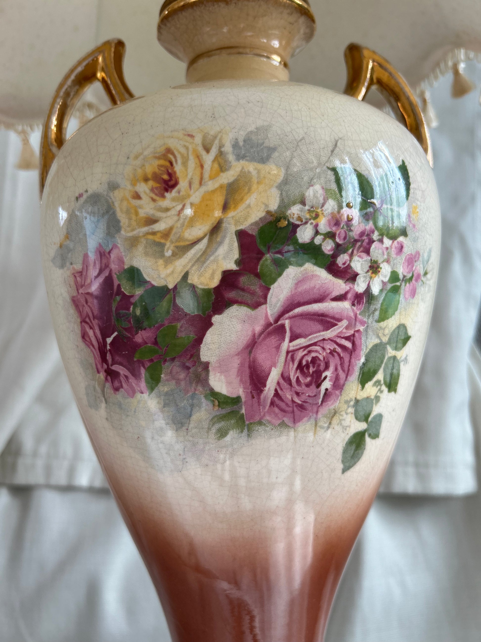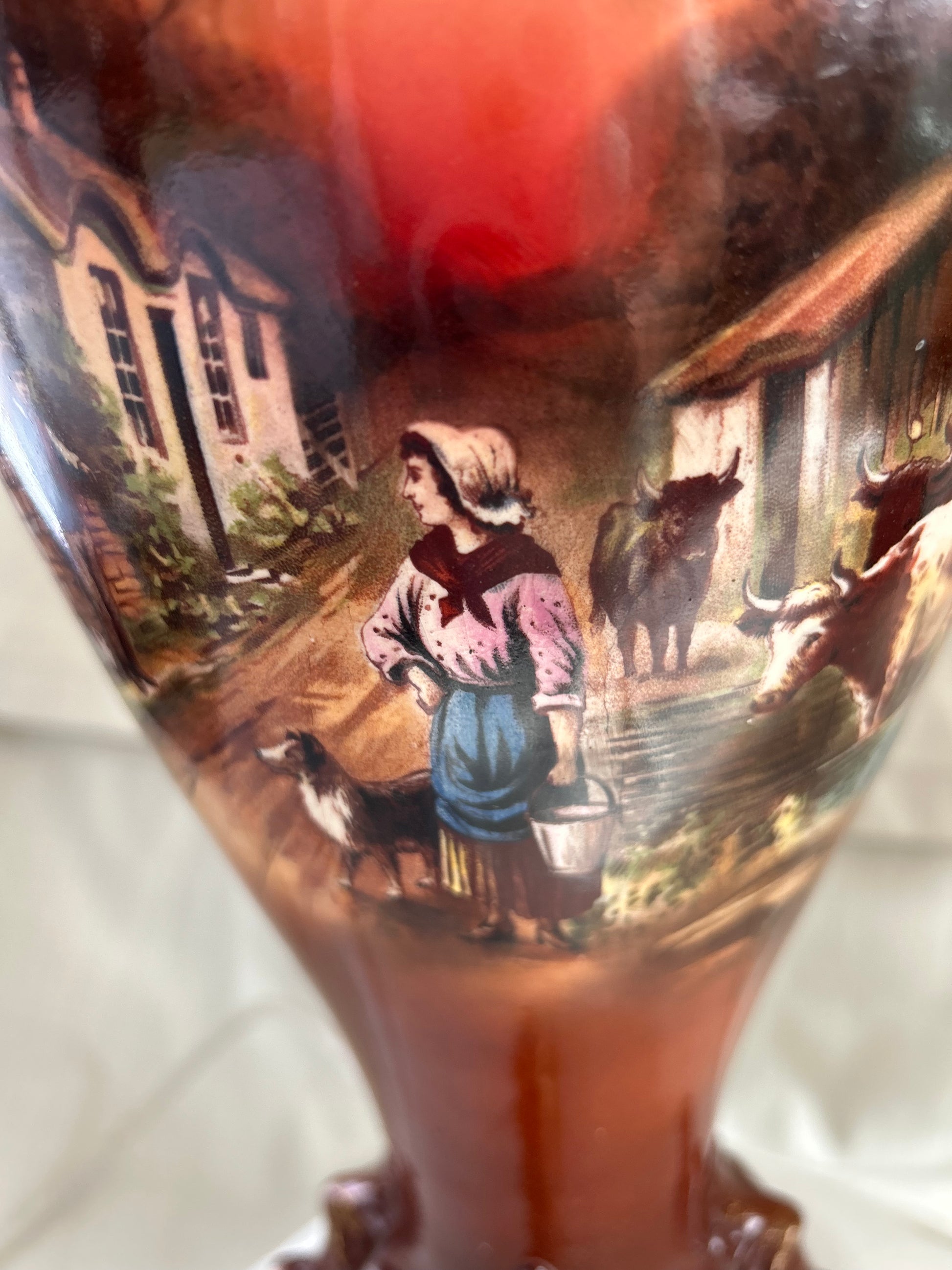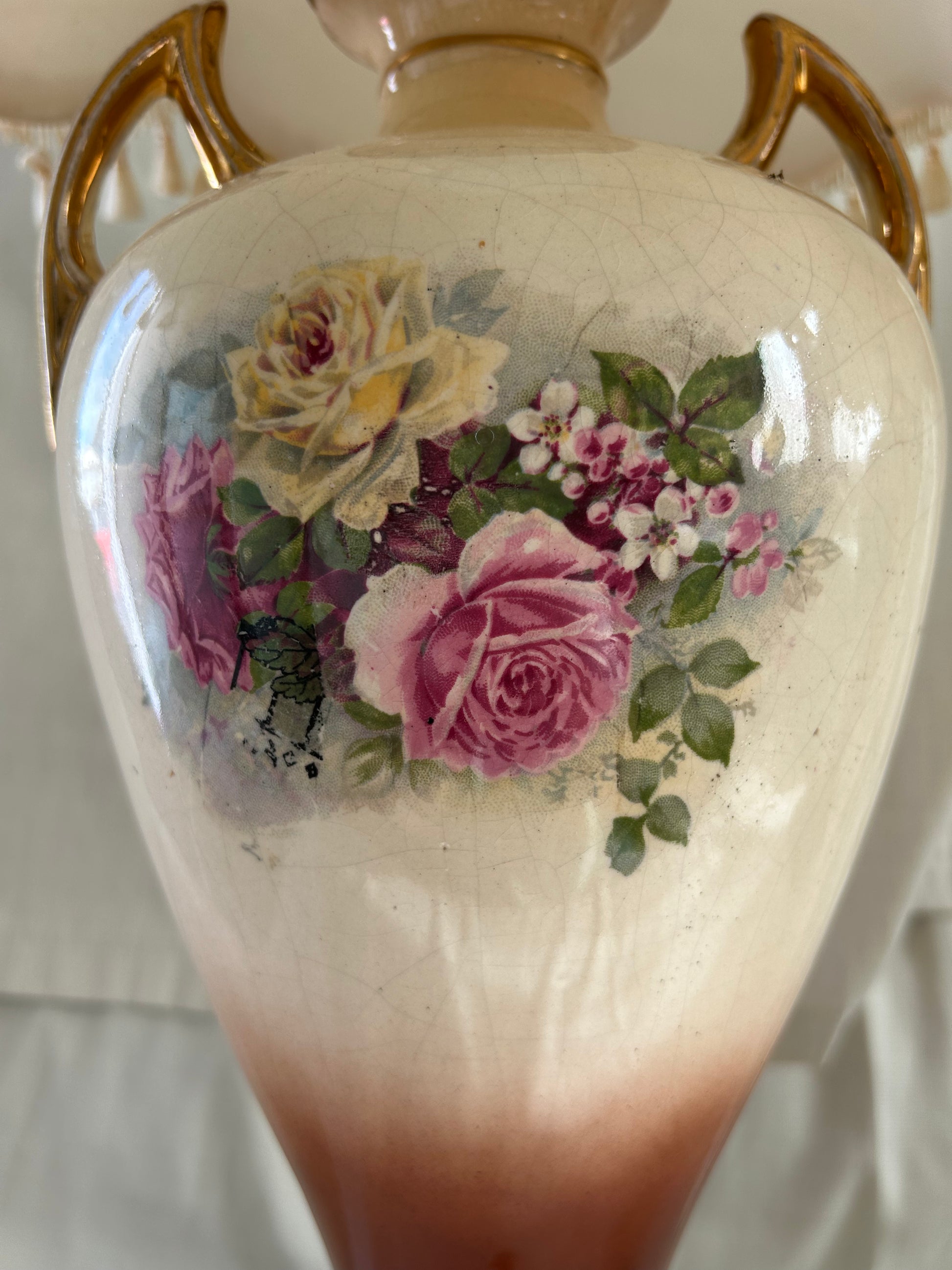 Vintage Rare Falcon pastoral Ware Pottery Vases Converted To Lamps. Stunning pair of falcon pastoral ware lamps converted from vases. Pretty scenes to the front and roses to the rear, the Gilt on parts of the lamps is worn in places and there is crazing to both lamps see photos. Both working but one needs a bulb holder which will be replaced. The number on the base which reads 730. Shades measure 30.5cm H x 36cm base diameter x 18cm rim diameter - Lamps measure 39cm H x 16cm w at its widest point